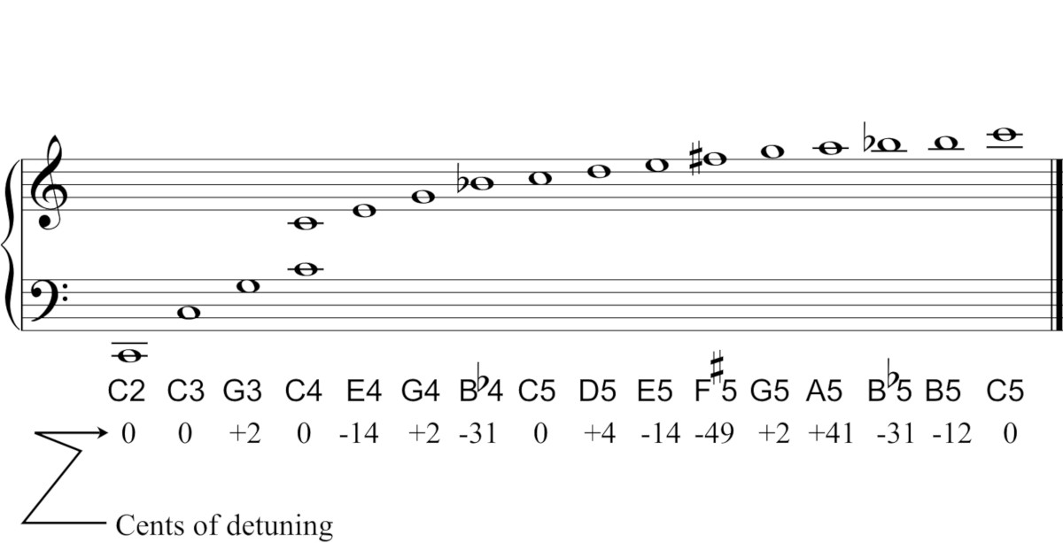 Many instruments are unable to sound their fundamental frequency so the first gap at the bottom of their range, as on the bugle, is from C to G, i.e., a fifth. The other notes in the series are shown in the figure below, along with the proportion of detuning or out-of-tuneness of each note. This latter feature is discussed elsewhere in this blog.