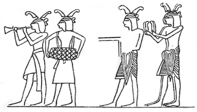 Some Egyptian iconography shows a different combination of instruments this time with a barrel drum and a person playing the clappers. It seems likely that the third person from the left is also playing a musical instrument but the details of this are now lost.
