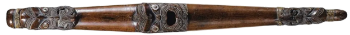 An instrument still in use and described over the years in ethnographic reports which incorporates the pu/bu root in its name is another Maori one, the putarino. This also incorporates the calling theme as it is shaped like the cocoon of the case moth and has a blowing device designed to allow it to be blown either as a brass instrument - when it is seen as being male - or as a flute - when it adopts a female persona. Thus, the instrument, being associated with both genders and, as with an overall shape of a cocoon, it forms a real-life Chamber of Creation, mimicking the chamber in which the case moth undergoes its metamorphism, before emerging as a newly-created moth. Whichever way it is played, the musician must ask permission of the spirit which resides within it before blowing. (Holmes 2022: Figure 5.7) A putorino is shown in the image below.