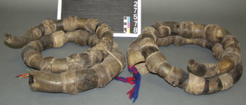 In Peru and the Andes in general, one dual-gendered pair of instruments reported in the ethnographic literature has a name which contains the pu/bu root, the wakrapuku. In the Quechua language, it is known as the waqra phuku where waqra means horn and phuku to blow. While it is usually today made from cattle horn or metal, and are considered to be a post-Spanish conquest replacement for the earlier pututu, a shell horn, (Titanostrombus galeatus), which was used in pre-Columbian times. Today, it is created from interlocking sections of animal horns and is still in use as well as having been reported in ethnographic contexts. A pair of these instruments exhibit similar symmetry to the bronze lurs and the wakrapuku is found in use today in Peru and throughout the Andes generally. They exist as a pair of instruments in right and left-handed forms, a pair consisting of one each of a right and a left handed instrument. They are played in an annual fertility ritual and the actual instruments themselves are reported by the players as being male and female although in the reports I have seen, the players were unable to identify the individual genders of their instruments. (Holmes 2022: Figure 5.4) The image below shows a pair of wakrapuku.