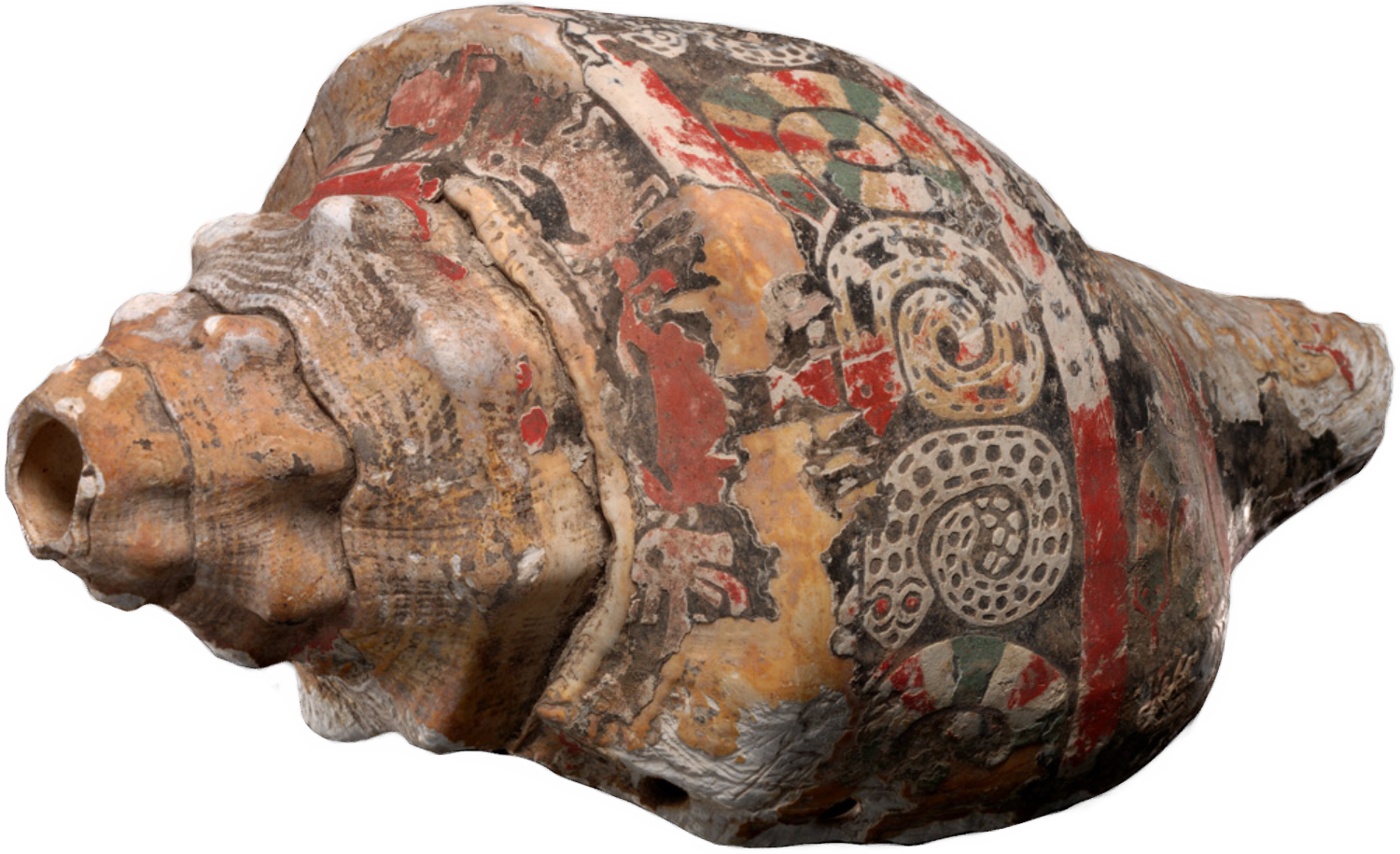 Description: A Chupícuaro shell trumpet made from a sea shell with stucco and pigment, measuring 110 x 150 x 245 mm. Chupícuaro is a an archaeological site which is to be found in the Lerma River basin in Western Mexico. The Chupícuaro people had a vibrant ceramic tradition and part of their culture involved the decoration and use os sea-shell/conch shell trumpets. Where it was found, in the western part Mexico, lies thousands of miles from the Caribbean where sea snail who lived in the shell grew up. This huge gap between the source of the shell and where it was found means that it was traded all that great distance over the Gulf of Mexico and and then the many hundreds of miles overland then being decorated decorated and blown in Chupícuaro in Western Mexico.