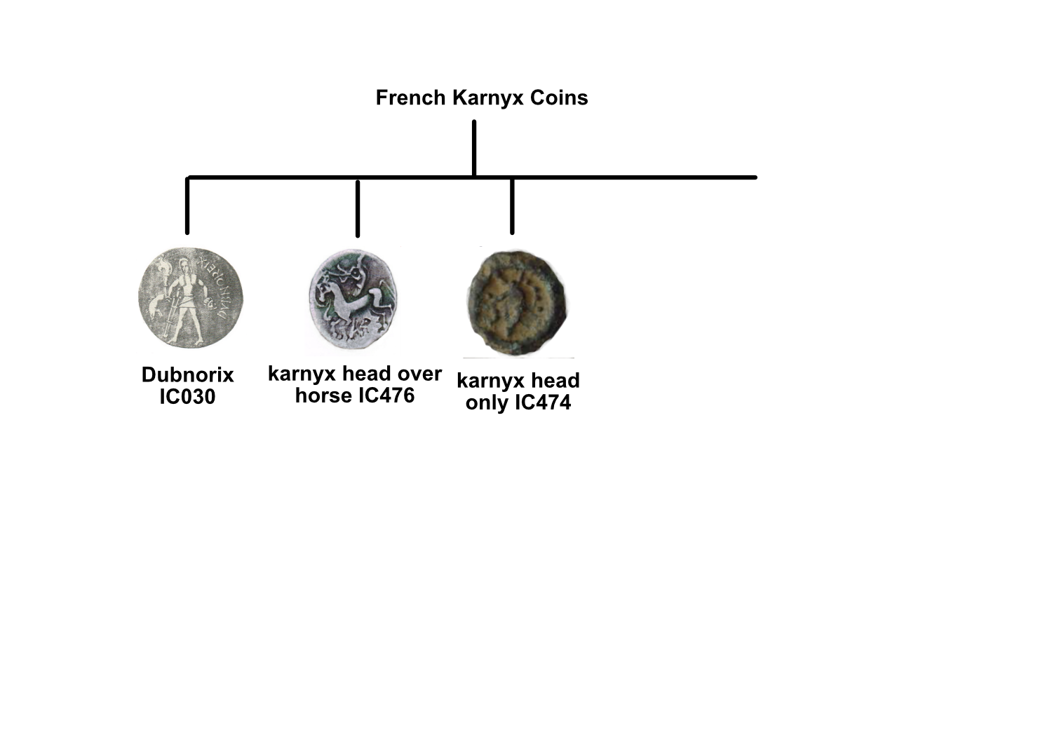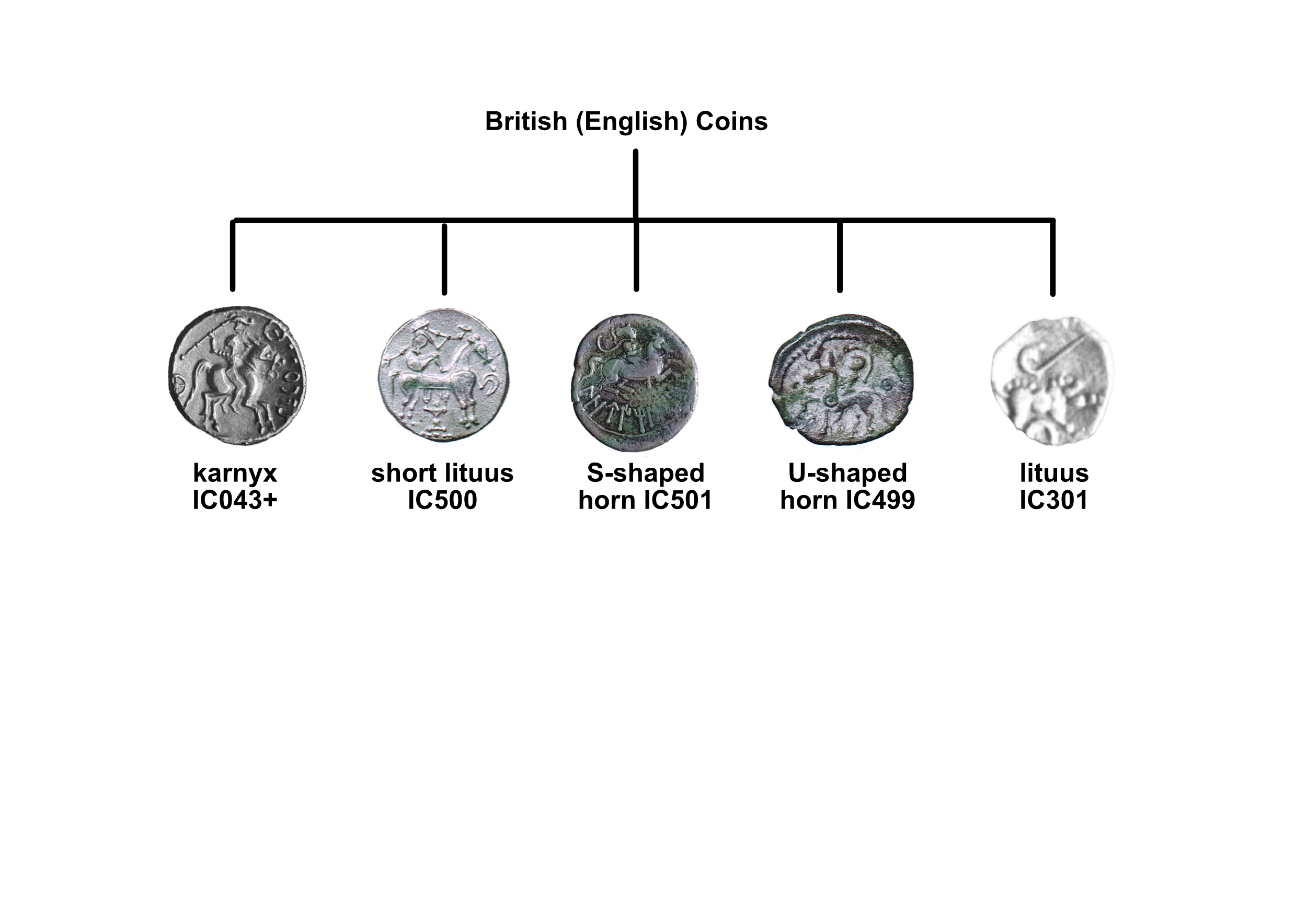 The coins of the Native tribes from Britain depict the five different instruments shown below with a number of different varieties of theseexisting, particularly the karnyces. Interstingly, the five instruments shown bear a striking similarity of type to those seen on the Cumae frieze (IC498):