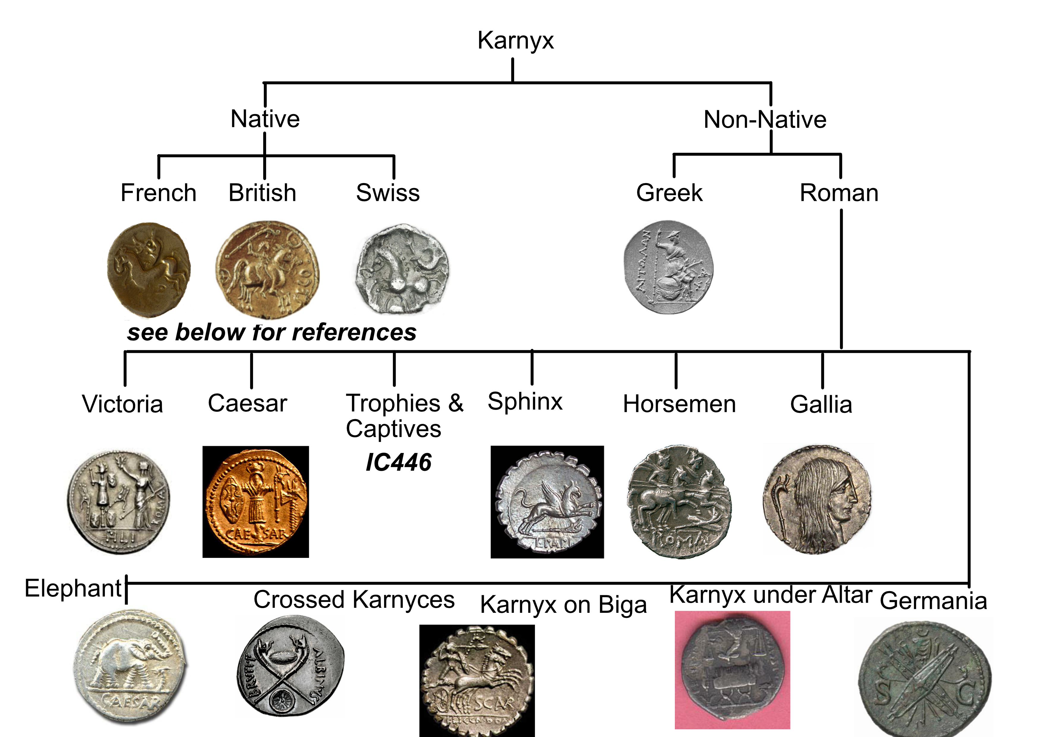 Description: Coin listings are grouped according to their utility in the research on brass instruments. For this reason, as those depicting the karnyx are by far the most prolific and invaluable in their representations, they are listed as a category. two categories are provided; karnyx coins and other-instrument coins.