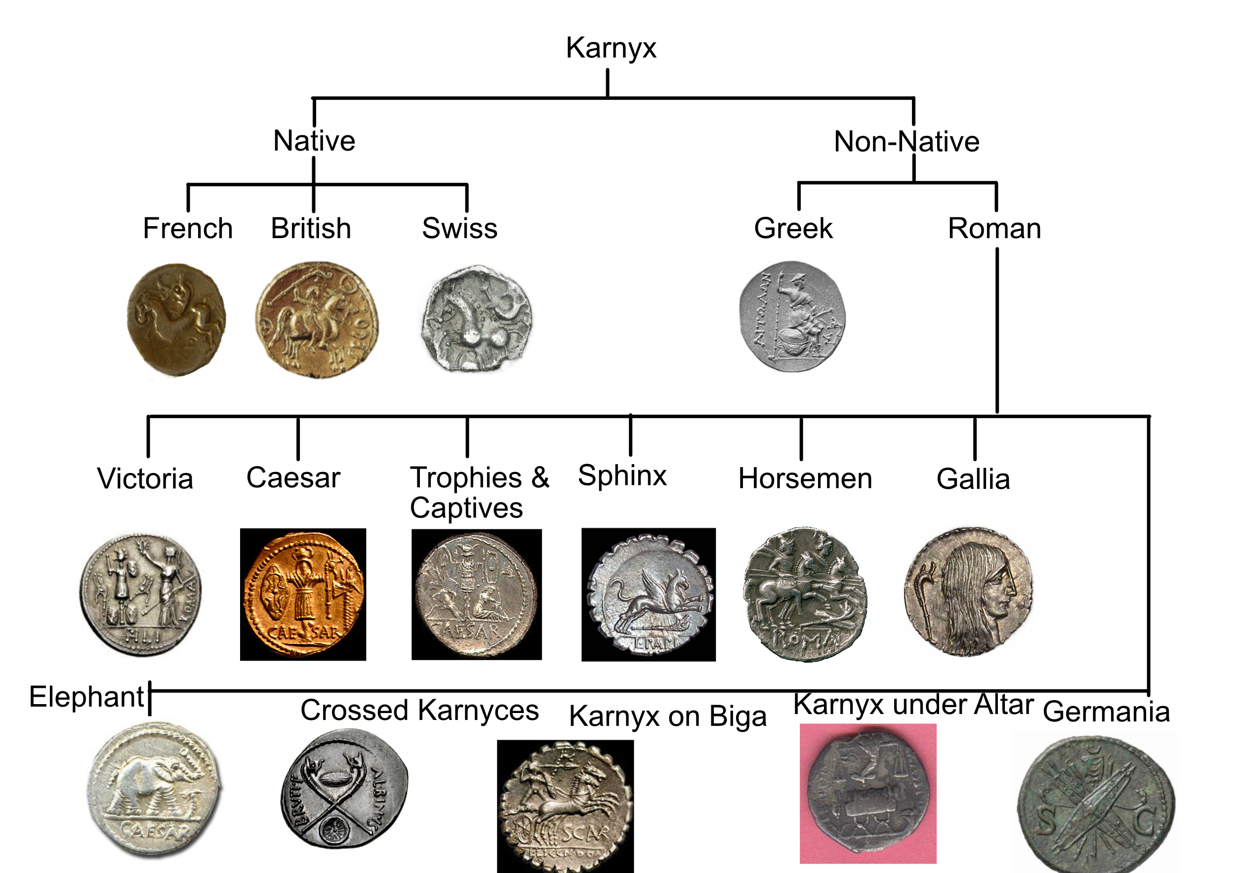 Two different types of coins depict the karnyx, those from the Native peoples of Europe showing their own instrument and the Roman coins which depict the instruments of the people they subjugated.