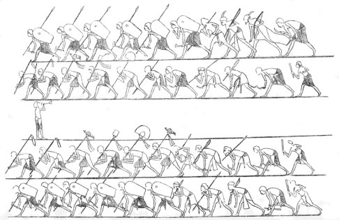 There have been many detailed interpretation of this iconography by Hickmann and Davies among others but what is of interest here is their opinion of the role of the trumpeter. The general view is that he is not just a humble rank and file foot soldier with his horn but, because of the centrality of the role which is depicted here, he was an officer of considerable rank. Egyptian iconography was highly sylised and the size, position and presentation of an individual in a scene held great significance in terms of their social or military rank.