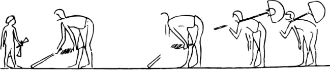Description: In a scene from Tomb Huya, el-Amarna (The Tombs), standard bearers and Royal chariot drivers bow before a dignitary. A trumpet player faces these four characters. The trumpeter is depicted smaller than the other people and, in his hands, he holds a trumpet and the wooden insert which sits in the trumpet when it is not being played.