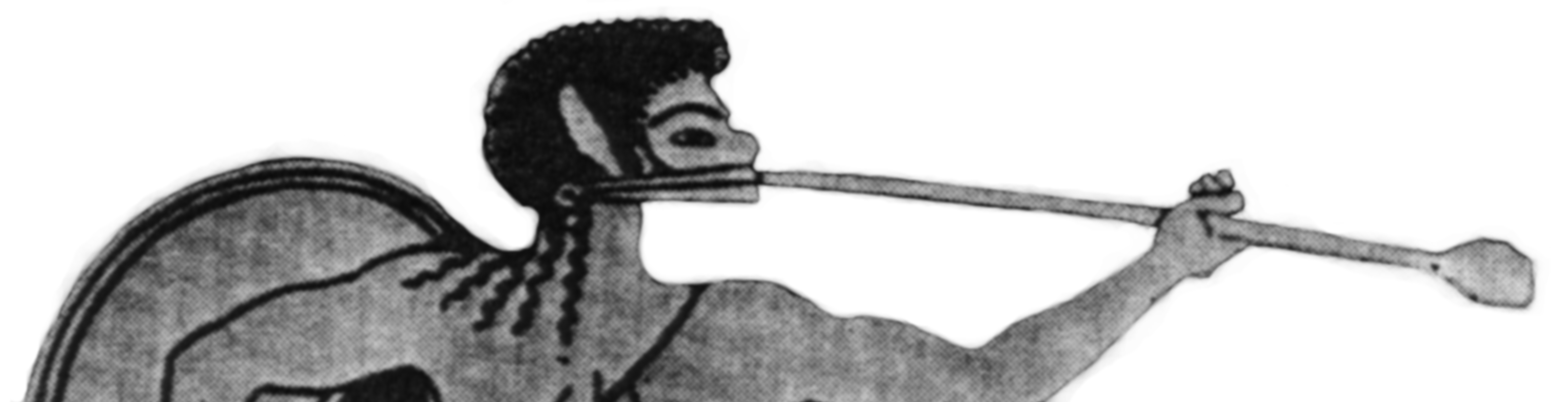 Current Location: British Museum, No. E5 Greek & Roman Department, Object reference number: 1842,0407.23 Description Illustration of a Satyr blowing a Salpinx on an Athenian Red-figure eye-cup made by Hischylos and signed by painter Epiktetos H. The player wears a phorbeia. Produced in Attica