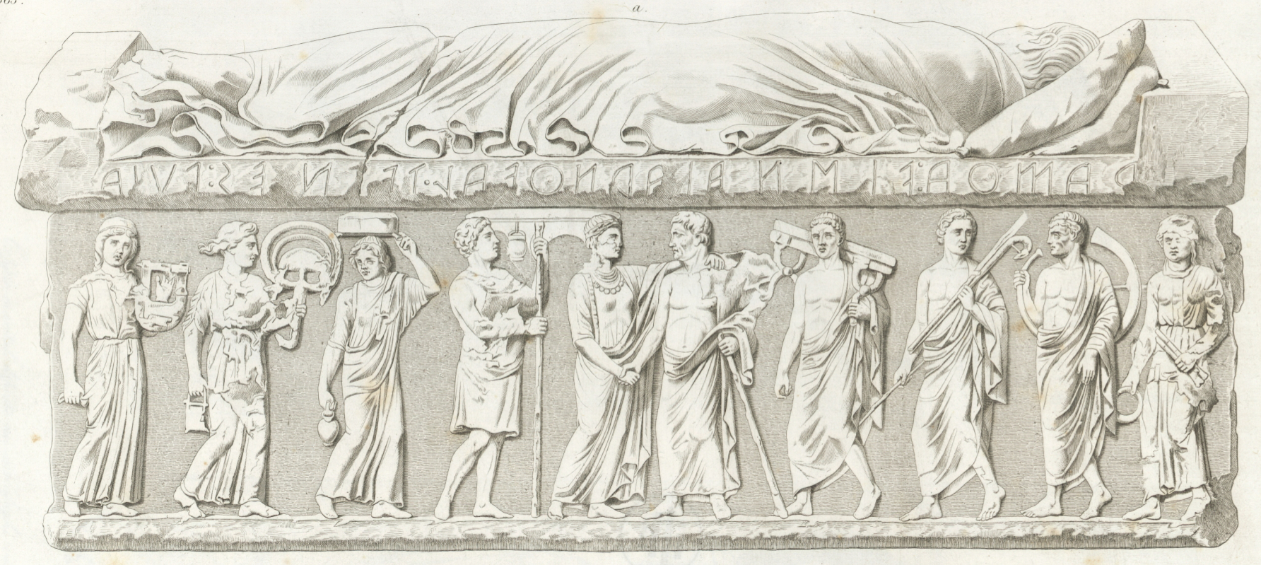 Description: Cornu and lituus players among a group of figures on an Etruscan sarcophagus.