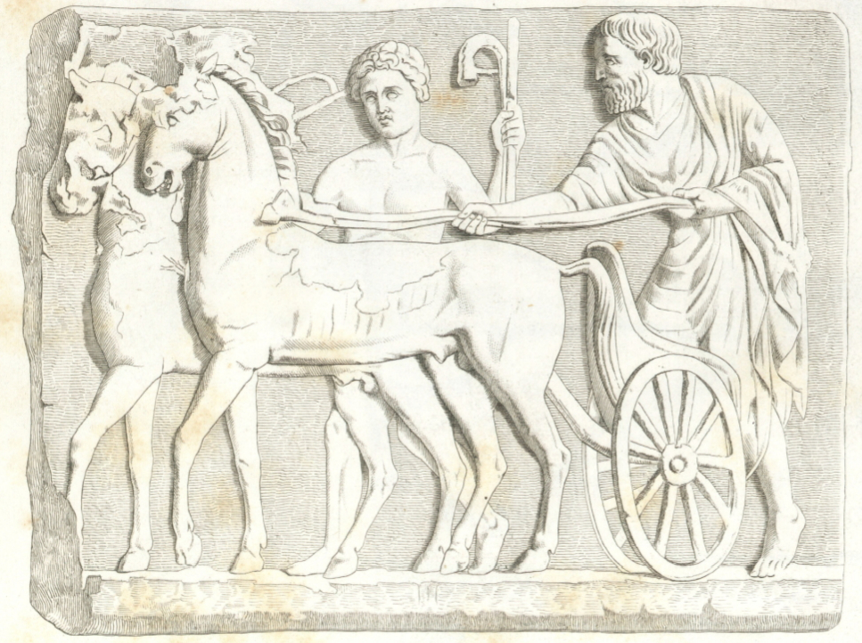 The right short side [Figure IC115-2] shows a slim, bearded man steeping into a chariot drawn by two horses, attended by a youth with a rod and a lituus, symbols of the bearded man’s status as a magistrate. Although he is sometimes identified as Arnth Tetnies, his appearance in fact shares nothing in common with the portly,clean-shaven man we see else- where on the coffin except a prominent aquiline nose. Brendel, with characteristic sensitivity, describ