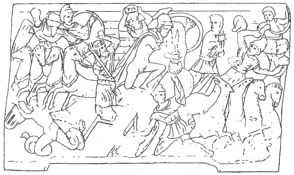 Description: An illustration from a much-later period (250-225 BCE), from Chiusi, a U-shaped cornu is shown (top right-hand corner of image) being played in a battle scene. The portrayal is of a Seven Against Thebes scene and it cannot be said whether it is a portrayal of contemporary practice, rather than an anachronistic rendering of an ancient theme by a 2nd century BCE artist. However, as this portrayal is of a battle scene, it may be that the use of the U-shaped form was continued in the military long after the development of the larger more-curved instruments seen in ensembles. Seven Against Thebes is the third play in an Oedipus-themed trilogy produced by the Greek author Aeshylus in 467 BCE. References to the tale, both written and graphic, are more common in Greek sources. Aeschylus does not describe a scene like this in his play and does not refer to any instrument which might be construed as a cornu of any sort but does refer to one of the seven champions, Tydeus, who awaits the call of the salpinx before engaging in battle: