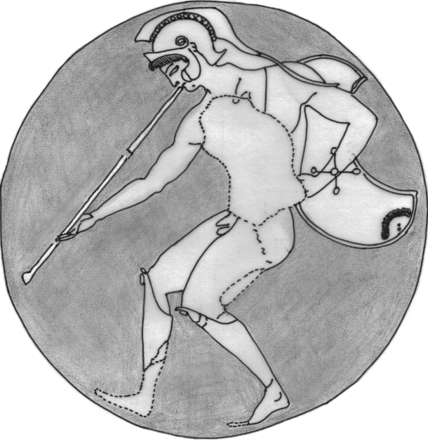 Description: Image of a salpinktes blowing and wearing greaves while carrying a shield