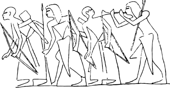Description: In a scene on a wall in the Temple of Abu Simbel, the battle of Qadesh (probably about 1286 BCE but certainly between 1290-1224 BCE) is depicted. In this image, soldiers are seen preceding a trumpet player, who is blowing his instrument. One author observes that only two images show the trumpet player following the soldiers, this being one of them.