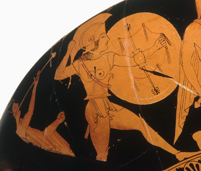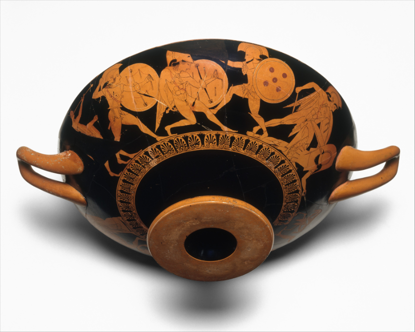 Description: Terracotta kylix (drinking cup), Attributed to Psiax Interior, archer leading horse Exterior, obverse, combat; reverse, warrior mounting chariot