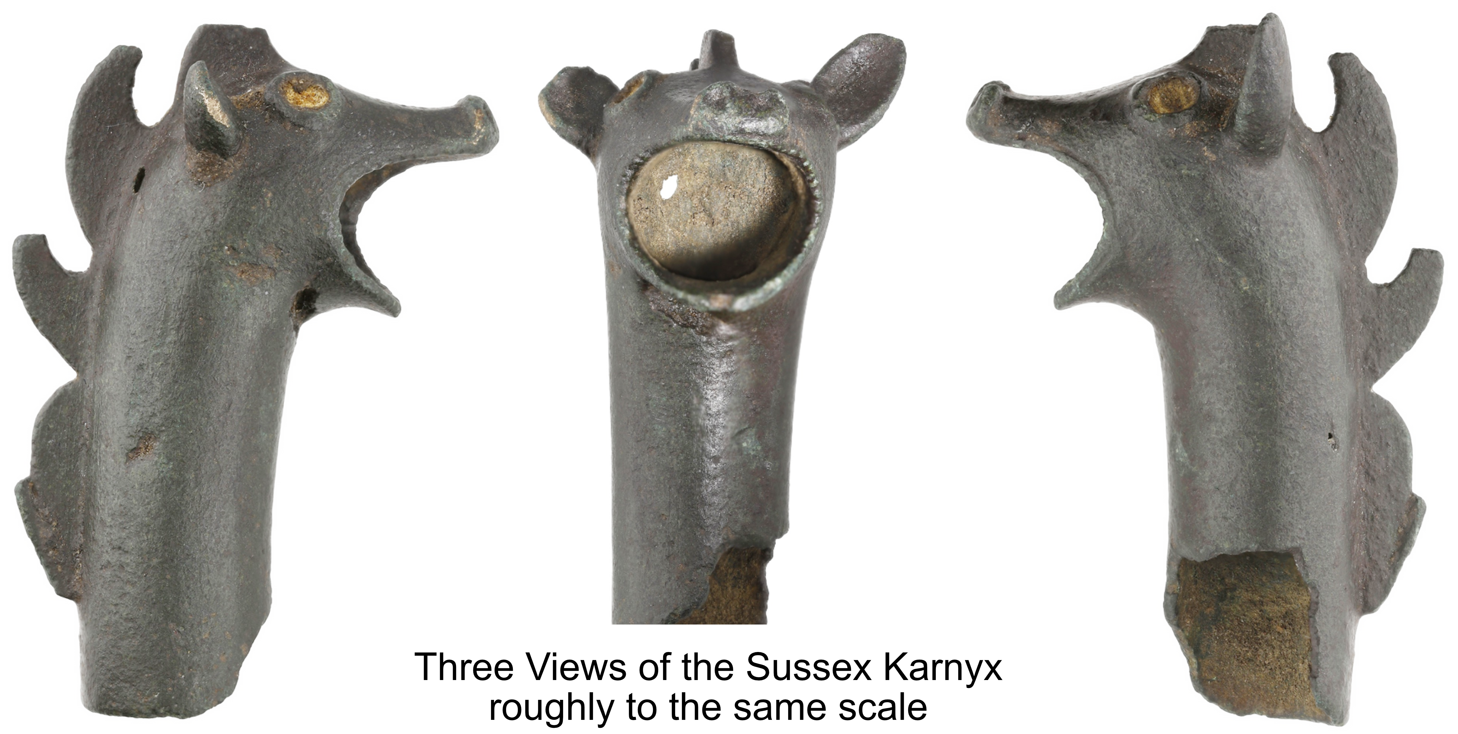 Although much smaller than the only other recorded carnyx [NB. This is incorrect] from Britain (the Deskford carnyx found in 1816), the snarling open-mouthed boar with its bristling spine is a compelling argument that it is in fact a miniature sounding bell. Carnyxes were used in battle and ceremonies as lip-reed instruments. The bell would have been mounted on a vertical hollow pole with a mouthpiece at the bottom. Three carnyx players are illustrated on the famous Gundestrup cauldron